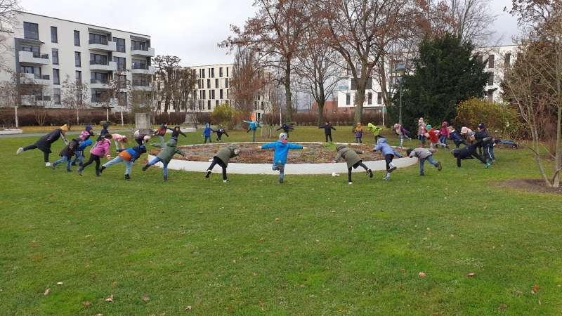 Die Bären und die Drachen nehmen die aktuelle Lage zum Anlass den Sportunterricht kreativ zu gestalten und Draußen an der frischen Luft Bewegungsübungen zu machen. Die Kinder laufen, gehen, spazieren, dehnen sich, bewegen sich, halten Gleichgewicht und haben Spaß. So integrieren wir neben dem gesunden Pausenbrot auch die Bewegung an der frischen Luft in den Schulalltag und hoffen auf nachhaltige Wirkung