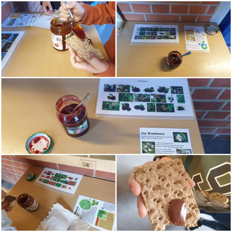 Die Klassen der Bären, Drachen, Eulen, Luchse und Krokodile beschäftigen sich gerade mit dem Thema Hecke. Aus vielen Heckenfrüchten können lecker Brotaufstriche hergestellt werden. Die Kinder durften Brombeermarmelade, Hiffenmark, Haselnusscreme, Schlehenmarmelade, ... verkosten und einige Kinder haben hier neue Lieblingsbortaufstriche "gefunden".