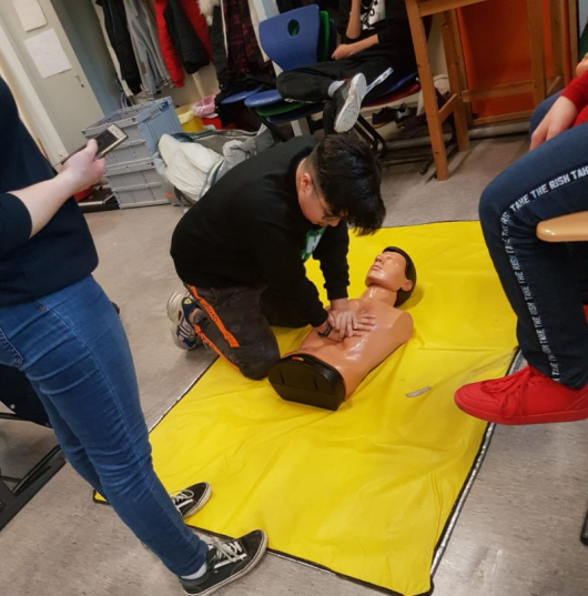Ob Unfall auf dem Schulhof, Verkehrsunfall auf dem Schulweg, Brand oder Kreislaufkollaps: Dabei ist es wichtig, richtig zu handeln! Die 9. Klassen lernen das gerade bei dem 1. Hilfe-Kurs, der jeden Mittwochnachmittag im Januar stattfindet. Die neuen Ersthelfer lernen diese sechs Maßnahmen: 1. Verletzte retten 2. Die Unfallstelle absichern 3. Lebensfunktionen prüfen 4. Wiederbelebung mit Herzmassage und Atemspende 5. Die richtige Lagerung 6. Die Betreuung des Verunglückten Das Beste dabei: Die Schülerinnen und Schüler beteiligen sich mit viel Spaß und Engagement an diesem Kurs.