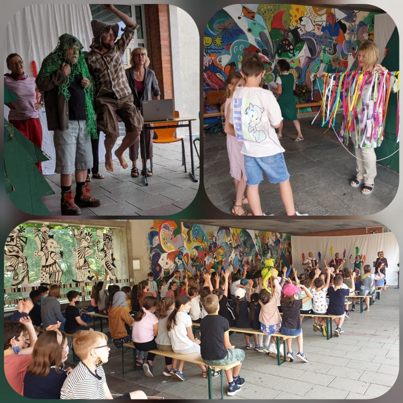 Am Dienstag, den 27.07.2021 verabschiedete die Grundschule Frau Frank, Frau Fischer-Krebs und Frau Heinrich. Die einzelnen Klassen haben den Lehrerinnen Geschenke zur Erinnerung an die Zeit an der Mönchbergschule überreicht. Zum Abschluss haben noch aktive und ehemalige Lehrkräfte ein Theaterstück aufgeführt, in Anlehnung an das Schuljahresanfangstheaterstück, das Frau Frank und Frau Reitzenstein über Jahre hinweg mit den Zweitklässlern einstudiert und aufgeführt haben.