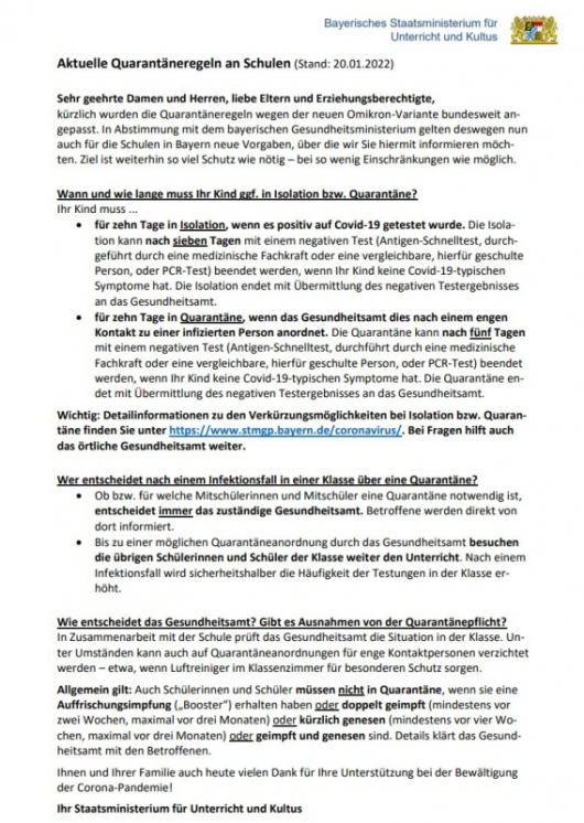 Sie erhalten hiermit die neuesten Quarantäneregeln vom Bayerischen Staatsministerium für Unterricht und Kultus. Bitte nehmen Sie diese Informationen zur Kenntnis. Wir bitten um Beachtung.