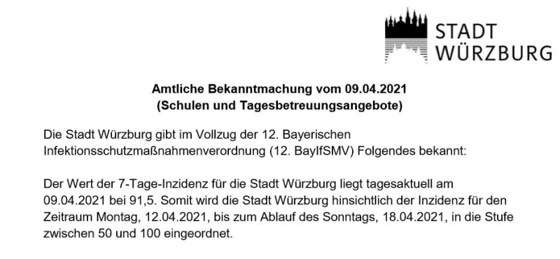 zur Durchführung des Unterrichtsbetriebs nach den Osterferien ergeht folgende amtliche Bekanntmachung der Stadt Würzburg. In Kürze: Wir haben den gleichen Unterrichtsbetrieb, wie vor den Osterferien - bis auf die neuen Regelungen zu den Selbsttests. Bitte beachten Sie dazu auch nachfolgende Schreiben.