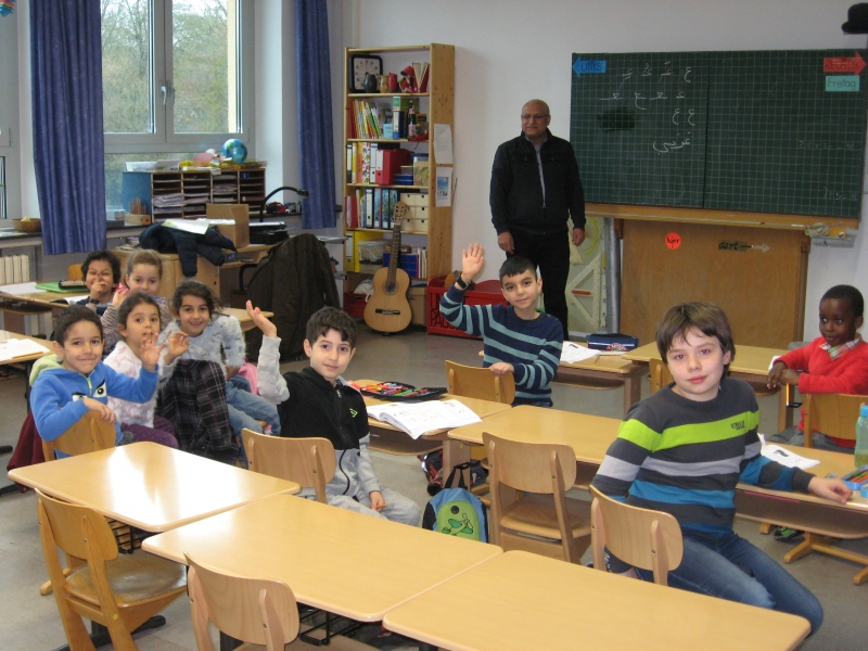 Samstags lernen Kinder und Jugendliche ihre Muttersprache Arabisch in Klassenzimmern der Mönchbergschule. In mehreren Gruppen wird vor allem das Lesen und Schreiben geübt. Es ist wichtig, die eigene Muttersprache zu beherrschen, auch wenn man schon sehr gut Deutsch kann. Herr Sharif Mohsen ist Mitglied im Vorstand des Ausländer - und Integrationsbeirats der Stadt Würzburg und leitet mit fünf anderen Lehrkräften ehrenamtlich den Arabischunterricht.