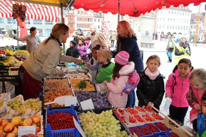 13.10.2016 Markus Hirt Am 6.10.2016 waren die Bären und Drachen auf dem Markt in Würzburg und haben Obst und Gemüse eingekauft. In den Klassenzimmern wurde dann der Einkauf zu Obstsalat und leckeren Brotgesichtern verarbeitet. zurück zur vorigen Seite
