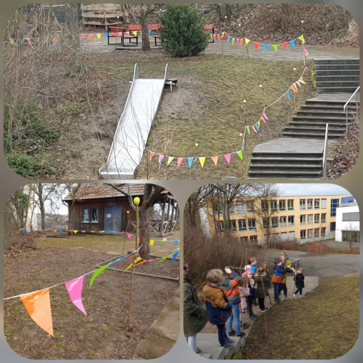 Die Kinder der Bären- und Drachenklasse haben eine Schutzzone für die Blumen und das Gras abgesteckt, sonst wird bei dem nasskalten Wetter alles matschig und im Frühjahr wächst nichts mehr. Dazu haben die Kinder mit Hilfe eines Metallstabes Löcher in die Erde getrieben und dann dahinein Haselnussstöcke gesteckt. An die Spitze kamen Tennisbälle, dass sich kein Kind an der Spitze verletzen kann und zum Abschluss wurde alles mit Fähnchen verbunden. So hoffen wir im Frühjahr Gras und Blumen auf dem Hang der Rutsche zu haben.