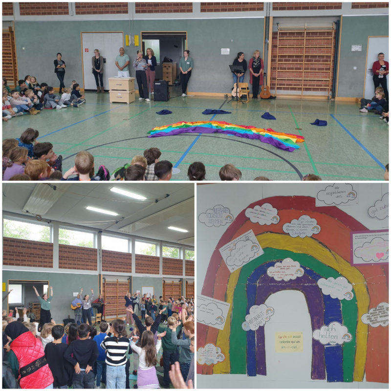 Die Begrüßungsfeier fand am 29.09.2025 in der Turnhalle der Mönchbergschule statt. Alle Klassen hatten sich im Vorfeld überlegt, was sie sich für ein gutes Miteinander im Schulalltag wünschen. Den Wunsch hatten die Kinder auf eine Wolke geschrieben und die Klassensprecher stellten diese dann der ganzen Schule vor. Die Wolken wurden dann auf den symbolischen Regenbogen gelegt und hängen nun im Schulhaus im Treppenhaus. Die Religionslehrkräfte der Mönchbergschule haben die Feier geplant und sehr wertschätzend durchgeführt. Danke an die verschiedenen Religionen und Konfessionen, die sehr gewinnbringend zusammengearbeitet haben (Islam, Katholisch, Evangelisch, Ökumenisch).