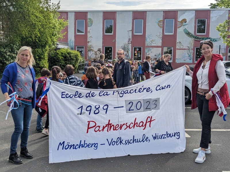 Nach dem bislang letzten Austausch mit unserer Partnerschule in Caen im Jahr 2019 (dort haben wir das 30 jährige Jubiläum begangen), war es nach vierjähriger Pause nun endlich wieder so weit. Am 9. Mai stand die gesamte Schule Spalier, um die Gäste aus Caen willkommen zu heißen.