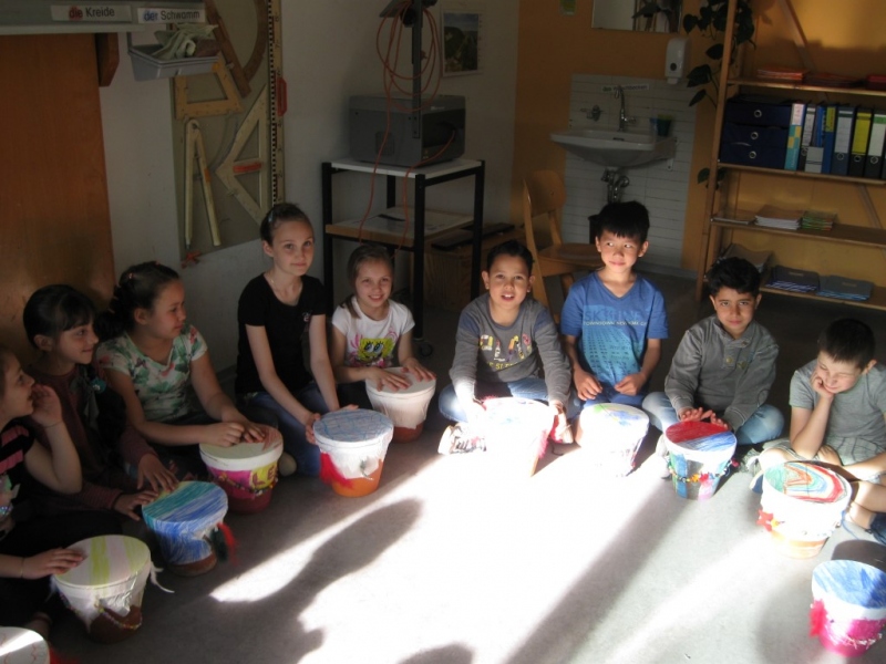 Im Rahmen des Musikunterrichtes haben wir in der Ü3/4 Blumentopf-Trommeln gebaut. Die Töpfe wurden bemalt und mit mehreren Schichten Butterbrotpapier und Tapetenkleister beklebt. Nach den Trocknen haben wir sie mit Perlen und Federn geschmückt. Der Trommel-Klang war erstaunlich gut! Zur nächsten Monatsfeier möchten wir die neuen Trommeln mit einem Trommellied aus Tunesien vorstellen. Wir danken den Eltern für die fleißige Unterstützung! Die Ü3/4