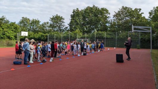 Der Wettergott war uns heute gnädig und die Bundesjugendspiele der 3. und 4. Klässler konnten wie geplant stattfinden. Nach einer schwungvollen Begrüßung mit dem Mönchberglied und einem gemeinsamen Aufwärmen rannten, sprangen und warfen die Schülerinnen und Schüler mit viel Begeisterung und hatten auch auf dem Spielplatz viel Spaß.