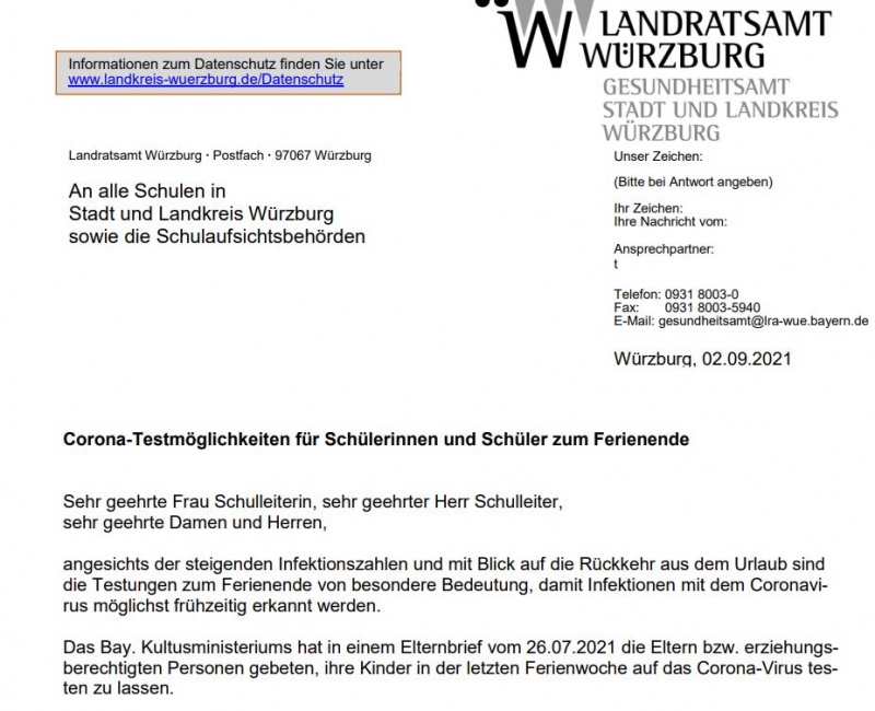im Zusammenhang zu unserer Bitte, Ihre Kinder vor dem ersten Schultag testen zu lassen, verweisen wir zur Unterstützung auf dieses Schreiben (hier weiterlesen) vom Gesundheitsamt Würzburg und bitten um Kenntnisnahme.