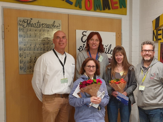 Foto: Abschieds- und Willkommensblumensträuße für Frau Pérez und Frau Wolz! V.l.n.r: Alban Schraut (Rektor), Yecla Pérez (scheidende Leitung OGTS), Barbara Wehr (Leitung OGS), Annette Wolz (neue Leitung OGTS), Jörg Kerber (Konrektor)