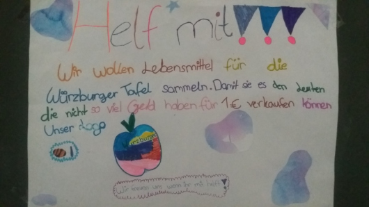 Die Kinder der Ethikgruppe in der dritten und vierten Klasse sammeln für die Würzburger Tafel. Bei der Würzburger Tafel gibt es sehr  preisgünstig oder umsonst gute Lebensmittel für Menschen die arm sind. Es gibt viele Leute, die nicht genug Geld zum Leben haben. Wir wollen das nicht vergessen und ein bisschen helfen. Alle Klassen helfen der Ethikgruppe und sammeln Geld oder anderes, was die Würzburger Tafel brauchen kann.
