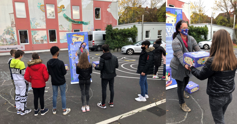 Am Dienstag, den 17.11, nachdem die Schüler noch gute Wünsche in ihren jeweiligen Muttersprachen auf die Grußkarten geschrieben hatten, war dann die Zeit für die Übergabe gekommen. Ilona Roppelt, eine Mitarbeiterin der Aktion, kam dafür eigens zu uns, um (coronakonform auf dem Parkplatz) die Geschenkboxen entgegenzunehmen. Vielen Dank für diese Mühe! Die Schüler haben sich sehr darüber gefreut.