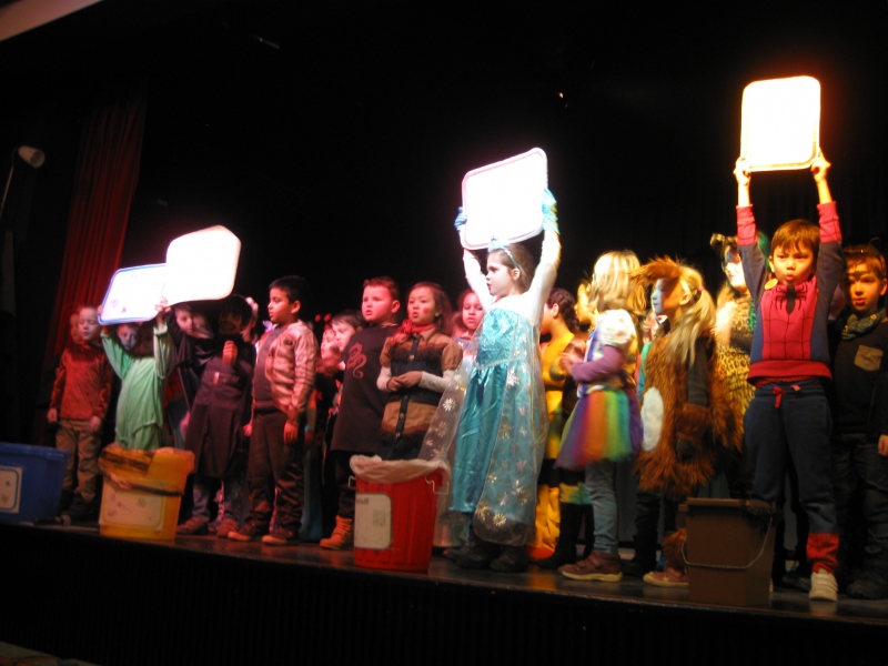 Die Bären und die Drachen haben an der Monatsabschlussfeier zu den Faschingsferien ihr Müll-Lied gesungen, in dem erklärt wurde, welcher Müll in welche Tonne gehört. Die anderen Grundschulklassen präsentierten musikalische und künstlerische Beiträge.