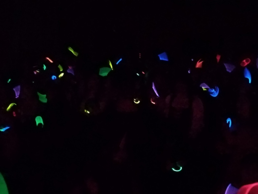 Die Grundschüler zogen durch das Schulhaus und besuchten viele Mittelschulklassen. Danach trafen sie sich Theatersaal und jede Klasse zeigte einen Beitrag. Zum Ende bekamen alle noch Leuchtarmbänder von einem besonderen Faschingsgast und winkten damit zum Abschluss Mönchberglied - siehe Foto.