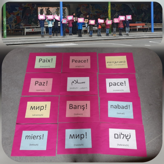 Heute fand die Begrüßung der Schülerinnen und Schüler nach den Faschingsferien im Pausenhof statt. Die Tigerklasse präsentierte das Wort Frieden in verschiedenen Sprachen. Wir wollen damit auch unseren Wunsch nach Beendigung der kriegerischen Handlungen in der Ukraine zum Ausdruck bringen - wir wünschen uns und vor allem den Menschen vor Ort in der Ukraine FRIEDEN!
