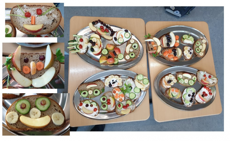 Die Eulen, Luchse, Bären und Drachen als jahrgangsgemischte 1/2-Klassen haben das Thema Obst und Gemüse behandelt. In der letzten Novemberwoche machten sie ein gesundes Frühstück in den jeweiligen Klassen. Dabei entstanden auch die lustigen gesunden Brote...