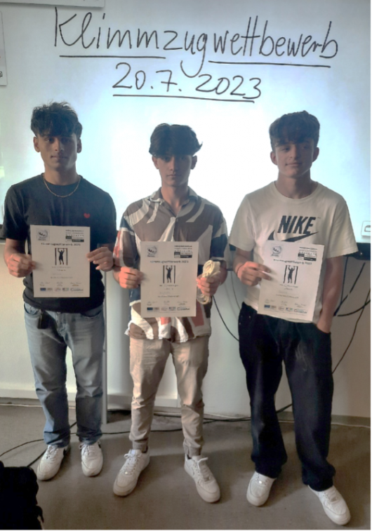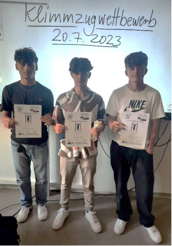 In der vergangenen Woche hieß es jeden Tag nach der zweiten Pause: Auf die Plätze, fertig, Klimmzüge! Die Schülerinnen und Schüler trainierten täglich, um dann am Donnerstag bei einem gemeinsamen Klimmzugwettbewerb der Mittelschule teilzunehmen. Unter lautem Anfeuern und gemeinsamem Mitzählen, bewiesen die Schüler Stärke und Mut. Mit ganzen 24 Klimmzügen belegte Najibullah Khan den ersten Platz. Dicht gefolgt von Rahman Babakakhel mit 20 Stück auf dem zweiten und Bleard Rexhaj mit 17 Stück auf dem dritten Platz. Herzlichen Glückwunsch an die Gewinner!