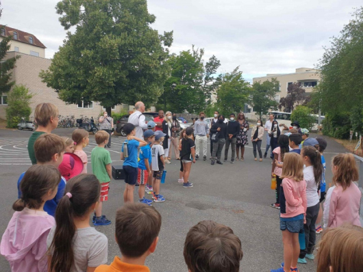 Eine Delegation von Lehrinnen und Lehrern aus Amerika hat sich die Mönchbergschule angeschaut und in fast alle Klassenzimmer hineingeschnuppert. Hier begrüßen Herr Schraut und die Bären- und Drachenklasse die Besucher.