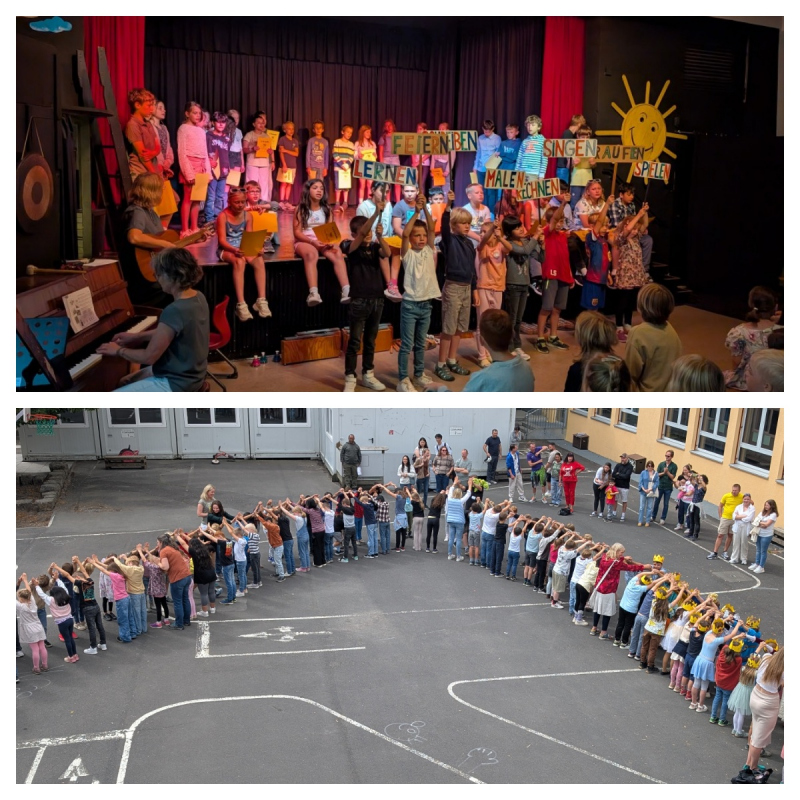 Mit 2 stimmungsvollen Monatsabschlussfeiern, die jeweils mit der Grundschulversion des Mönchberglieds endeten, verabschiedeten sich alle Grundschulkinder und ihre Lehrkräfte in die heiß ersehnten, wohlverdienten Sommerferien.