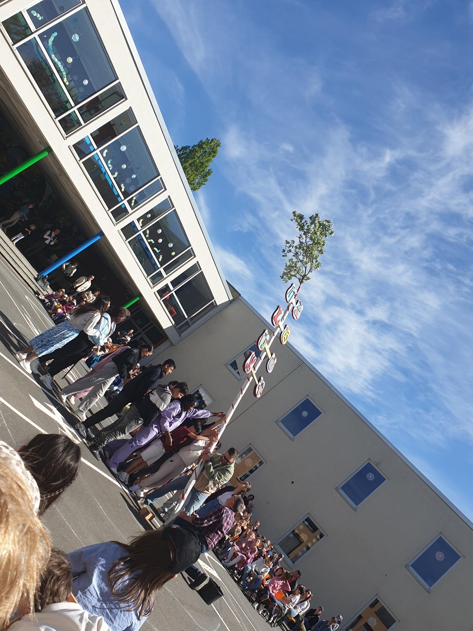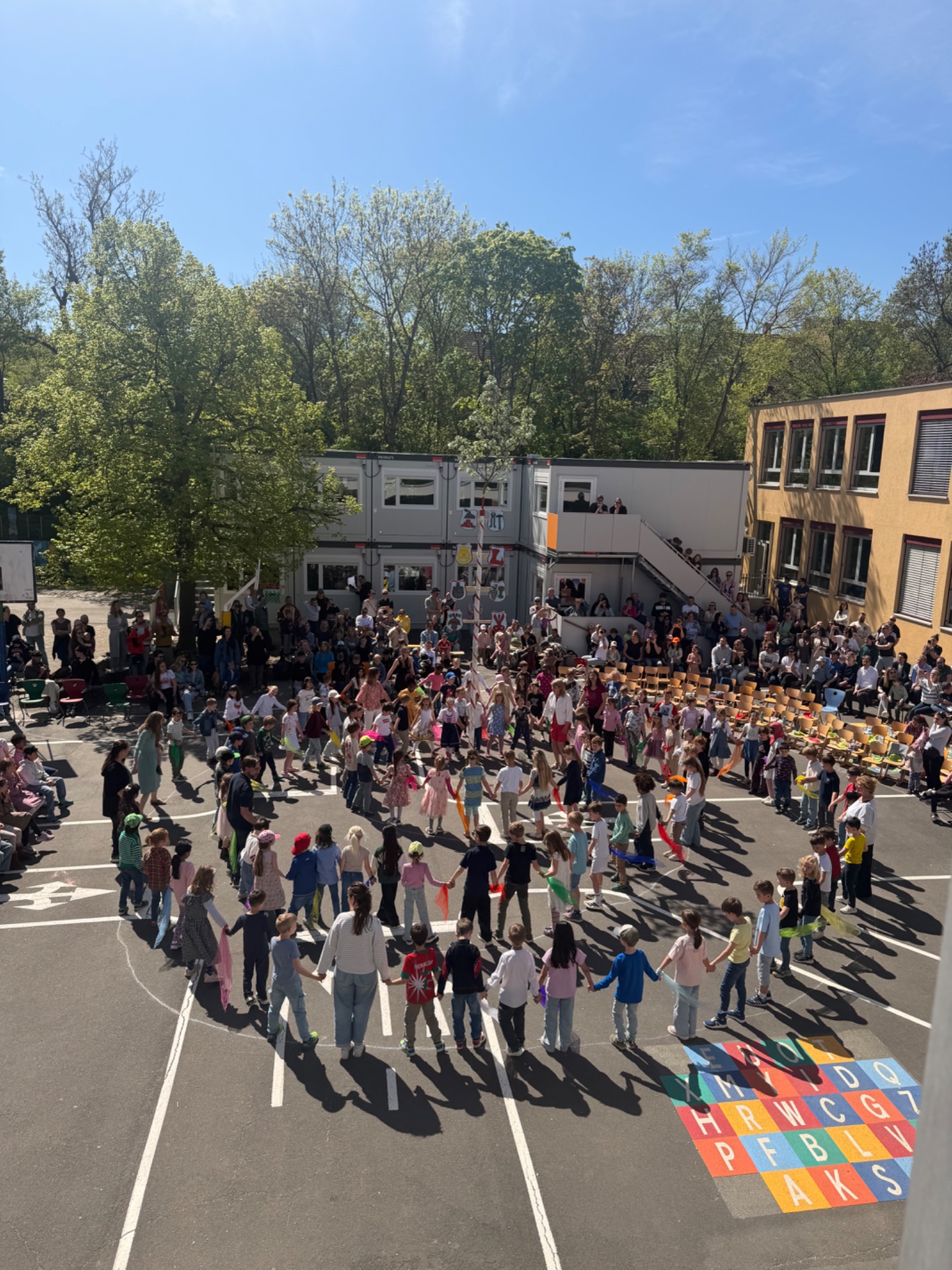 An der Maifeier 2026 wurde der Maibaum traditionell von den Mittelschülern aufgestellt. Die Symbole am aufgestellten Baum wurden von einzelnen Mittelschülerinnen und Mittelschülern in ihrer Erstsprache und auf Deutsch erläutert. Die Ersten und Zweiten Klassen bereiteten die Maienbrote zu und tanzten um den Maibaum. Die anderen Grundschulklassen zeigten musikalische und gestalterische Beiträge. Die Löwenklasse und der Förderverein kümmerten sich um die Verköstigung der Kinder und Eltern.