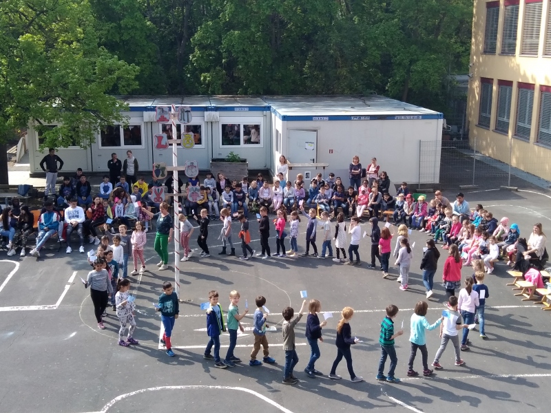 Die Maifeier fand am 2. Mai 2019 an der Mönchbergschule statt. Alle Klassen der Mönchbergschule beteiligten sich an der jedes Jahr stattfindenden Feierlichkeit. Mittelschüler stellten den Maibaum auf, andere präsentierten Lieder, Gedichte, Tänze, ... und zu guter Letzt wurden den Maienbrote verteilt, die in der Klassen der flexiblen Grundschule in der früh vorbereitet wurden.