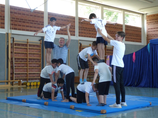 "Allez hopp", rufen die Zirkusartisten und -pädagogen Patrizia und Wolfgang und: Los geht's! Mit viel Freude und Ehrgeiz haben die SchülerInnen der Wölfeklasse eine Woche lang im Mitmachzirkus trainiert und sich als Artisten und Akrobaten bewiesen. Für jeden und jede ist in der Manege des Zirkus etwas dabei: Die Kinder balancieren auf dem Seil, turnen am Trapez, laufen auf der großen Kugel, bauen mit ihren Freunden Menschenpyramiden, stehen als Fakir barfuß auf Glasscherben oder verschwinden in einer Schwerterkiste, probieren verschiedene Jongliernummern mit Bällen, Tüchern, Diabolos, Devilsticks, Tellern, Keulen etc. und haben vor allem jede Menge Spaß. Am Ende des Projekts wurde natürlich auch eine Vorstellung präsentiert, in der alle stolz und glücklich ihre artistischen Künste gezeigt haben.