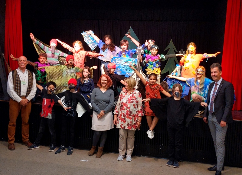 „2021 wird Deutschlands ältestes Mozartfest 100! Feiert mit uns und beteiligt Euch mit kreativen Ideen und Projekten am Jubiläum! Unter dem Motto „100 für 100“ – 100 Ideen für 100 Jahre Mozartfest – bieten wir Euch eine Plattform, auf der ihr zeigen könnt, was Mozart mit Euch und Euren Ideen zu tun hat!“ Dieser Einladung der Stadt Würzburg folgte die vierte Klasse der Mönchbergschule mit Lehrerin Christine Frank. Zusammen mit Janina Kempf, Leiterin des LBV (Landesbund für Vogelschutz in Bayern e.V.) thematisierten die Schülerinnen und Schüler die heimische Vogelwelt und verknüpften dieses Wissen mit Mozarts Zauberflöte. Das Ergebnis – ein 15-minütiges Theaterstück mit dem Titel „Mozart-Vogel-Modenschau“ – präsentierten die Kinder am vergangenen Freitag im Theater der Mönchbergschule. Die Kinder ernteten viel Beifall von – coronabedingt – einigen wenigen Zuschauern. Zu den Gästen zählte auch Oberbürgermeister Christian Schuchardt. In seinen Gruß- und Dankesworten an die Kinder hob er die Kreativität und die Freude am Theaterspiel, die im Unterricht erstellten Kostüme, vor allem aber die Idee hervor, Mozarts Musik mit dem sachkundlichen Thema „heimische Vögel“ zu verbinden. Nicht umsonst war die „Vogelidee“ aus 100 Projekten als eine der sechs Preisträgerinnen ausgewählt worden. Christian Schuchardt dankte Janina Kempf vom Verein Landesbund für Vogelschutz in Bayern für die Initiative und Lehrerin Christine Frank für die didaktische Umsetzung abschließend mit den Worten: „Mozart hätte seine Freude an der Aufführung gehabt!“