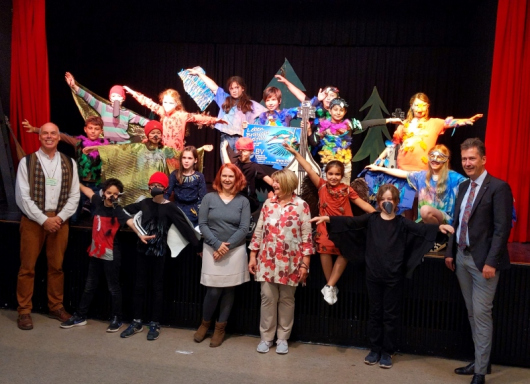 Auf dem Foto zu sehen: Mönchbergschul-Preisträger-Klasse mit Oberbürgermeister Christian Schuchardt (rechts im Bild) nach der Aufführung vom 2. Juli 2021 im Theater der Mönchbergschule