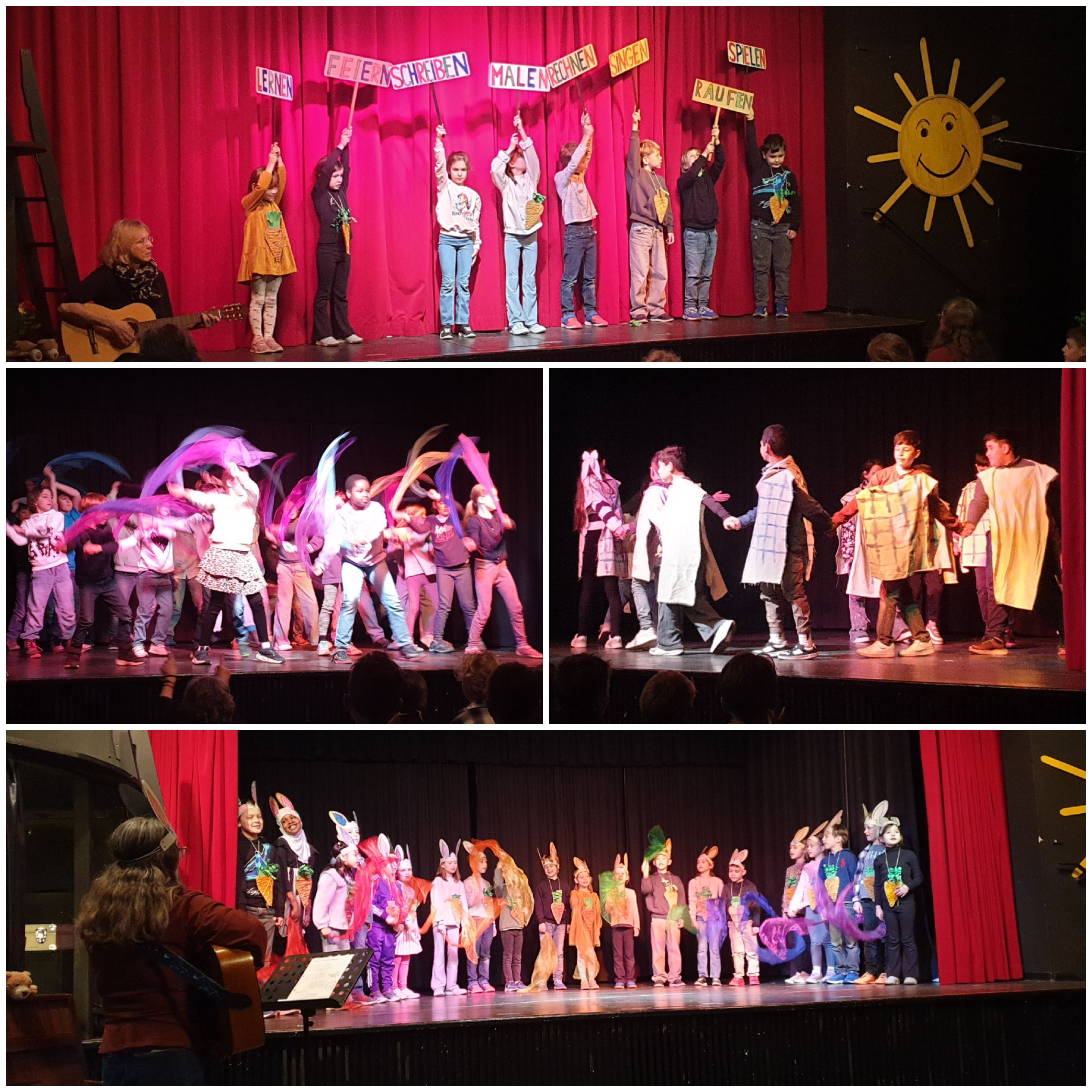 Die Monatsabschlussfeier zu den Osterferien fand wieder in zwei Blöcken statt. Viele Eltern besuchten den Theatersaal und würdigten die Beiträger ihrer Kinder.