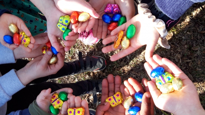 Der Osterhase meinte es heute gut mit uns. Wir haben im Mönchbergpark Ostereier und Schmetterlinge gefunden. Nacheinander haben die Erstklässler und dann die Zweitklässler gesucht. Zwei Hühner hatten sich so gut versteckt, dass die Zweitklässler lange gesucht haben. In einem großen Kreis haben wir uns dann alle endlich mal wieder gesehen und konnten uns frohe Ostern wünschen. Welch eine große Freude für uns alle. Danke an den Osterhasen.
