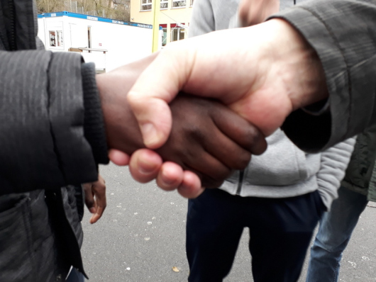 Schule ohne Rassismus – Schule mit Courage! Nicht bloß große Sprüche klopfen, sondern Handeln vor Ort – an der Schule – in der Pause ist angesagt. An der Mönchbergschule wird das jeden Tag gelebt. Große Schüler engagieren sich für ihre Mitschüler. Wird den Kleinen in der Pause ein Ball geklaut, können sie sich an einen großen Schüler wenden. Egal welche Hautfarbe der hat. Jeder Grundschüler kennt große Schüler aus der Partnerklasse. Dann wird das geklärt. Und die Kleinen bekommen den Ball zurück. Wir an der Mönchbergschule schaffen das! Hand drauf!