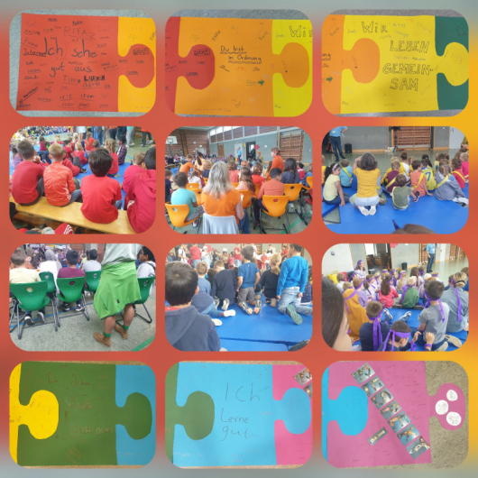 Bei der Schulfeier zum Schuljahresanfang 2023/24 haben alle Mittelschulklassen mit einer Partnergrundschulklasse (oder zwei Grundschulklassen) eine Schulregel vorgestellt. Viele Kinder waren in der Farbe der Schulregel gekleidet. Alle Kinder haben "ihre" Schulregel unterschrieben und intensiv mit der Partnerklasse an der Vermittlung der Regeln gearbeitet.