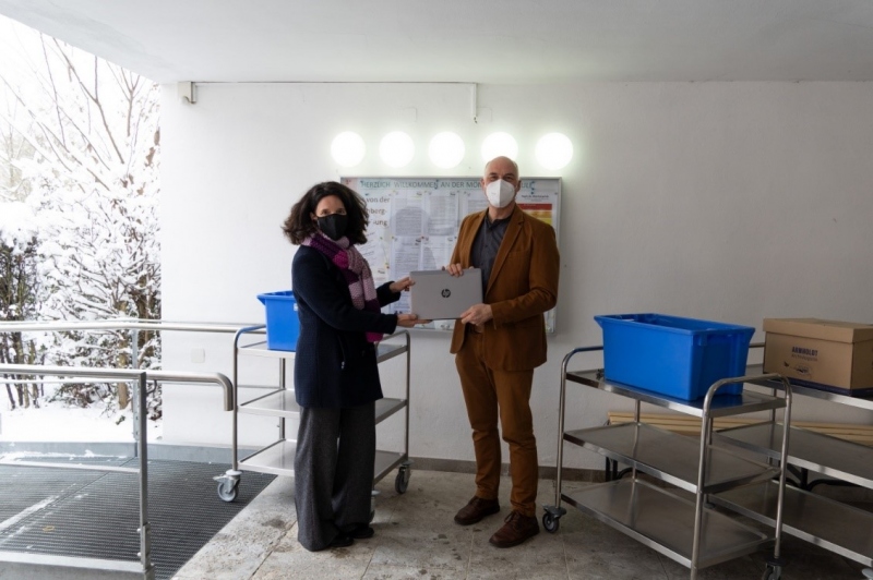 (Auf dem Bild zu sehen: Frau Dr. iur Pia Weinkamm (links), Mitglied des Vorstands der Fürstlich Castell’schen Bank, mit Dr. Alban Schraut, Schulleiter der Mönchbergschule Würzburg bei der Übergabe der Laptops am 09.02.2021)