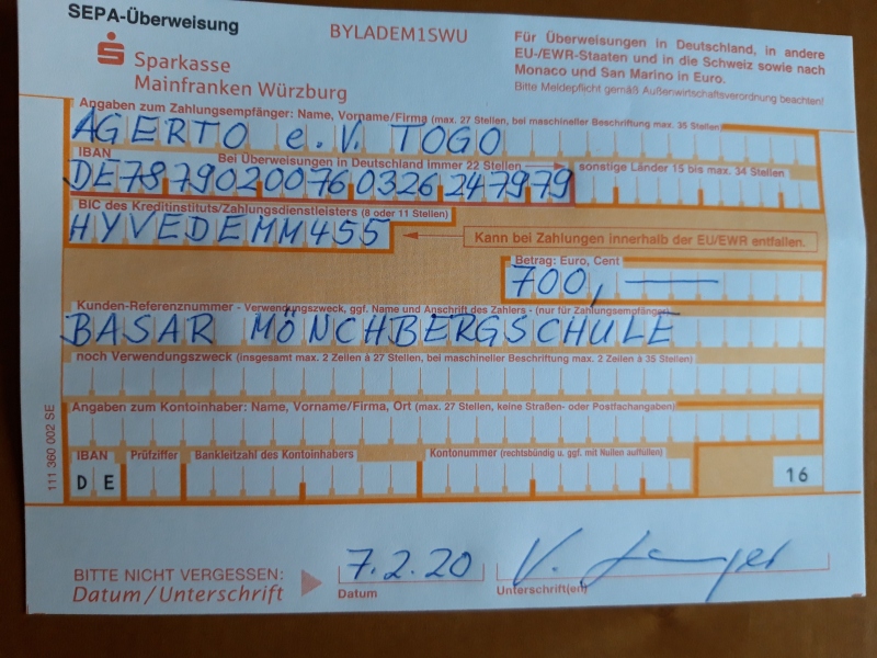 Wir bedanken uns sehr herzlich bei allen, die mit ihrem Kauf das Projekt Agerto in Togo unterstützt haben. Wir konnten heute 700,00 Euro überweisen! Vielen Dank an die fleißigen Schülerinnen und Schüler aus den Klassen der Bären und der D 5/7, die durch ihr Engagement beim Verkauf in der Pause diesen großen Betrag eingenommen haben.
