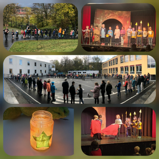 Am 10.11.2023 fand an der Mönchbergschule die Sankt Martinsfeier statt. Die Grundschulkinder zogen mit ihren Laternen oder bunten Gläsern durch den Pausenhof und das Schulgelände. Unser Rektor Herr Schraut und Frau Wunderlich begleitenden die Gesänge mit ihren Akkordeons.
