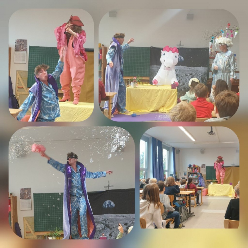 Diese Woche waren Schauspielerinnen und Schauspieler vom Stadttheater Würzburg in der Mönchbergschule und haben im Klassenzimmer ein Theaterstück aufgeführt ("Theater to go"). Die Kinder waren fasziniert und in den Bann der Geschichte gezogen, die für die Klassenstufe 1/2 "Käpten Taumel" hieß. Für die Klassenstufen 3/4 findet nächste Woche die Uraufführung "Das letzte Schaf" statt.