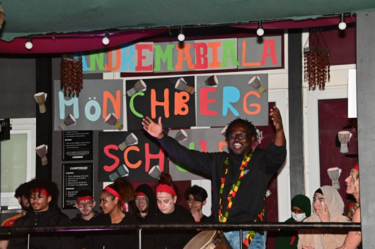 Mit dem Auftritt im Club Zauberberg endete das Trommelprojekt der Klasse DQ9 der Würzburger Mönchbergschule. Wochenlang hatten sich die Schülerinnen und Schüler unter Anleitung von André Mabiala auf diesen Abend vorbereitet. Zusammen mit ihrer Klassenlehrerin Mareike Eder und dem Teamkollege Mark Daues sowie Mabiala übte man afrikanisches Trommeln, teilweise im Klassenzimmer, teilweise auch direkt vor Ort im Club Zauberberg. Der Trommellehrer aus dem Kongo hat sich seit vielen Jahren zum Ziel gesetzt, das Trommeln seiner Vorfahren einem breiteren Kreis zugänglich zu machen. Die bei Auftritten eingenommenen Spenden gehen an den Verein „Mbonda Lokito Kongo/Kinshasa Kinderhilfe e.V.“, der im Kongo benachteiligte Kinder und Jugendliche unterstützt und deren Selbständigkeit fördert.