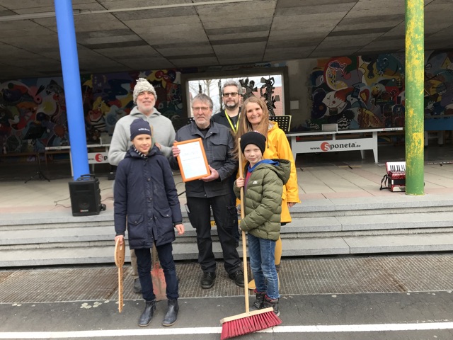 Der neue Hausmeister Herr Wallrapp wurde begrüßt und mit wichtigen Utensilien für seine Arbeit an der Mönchbergschule ausgestattet.