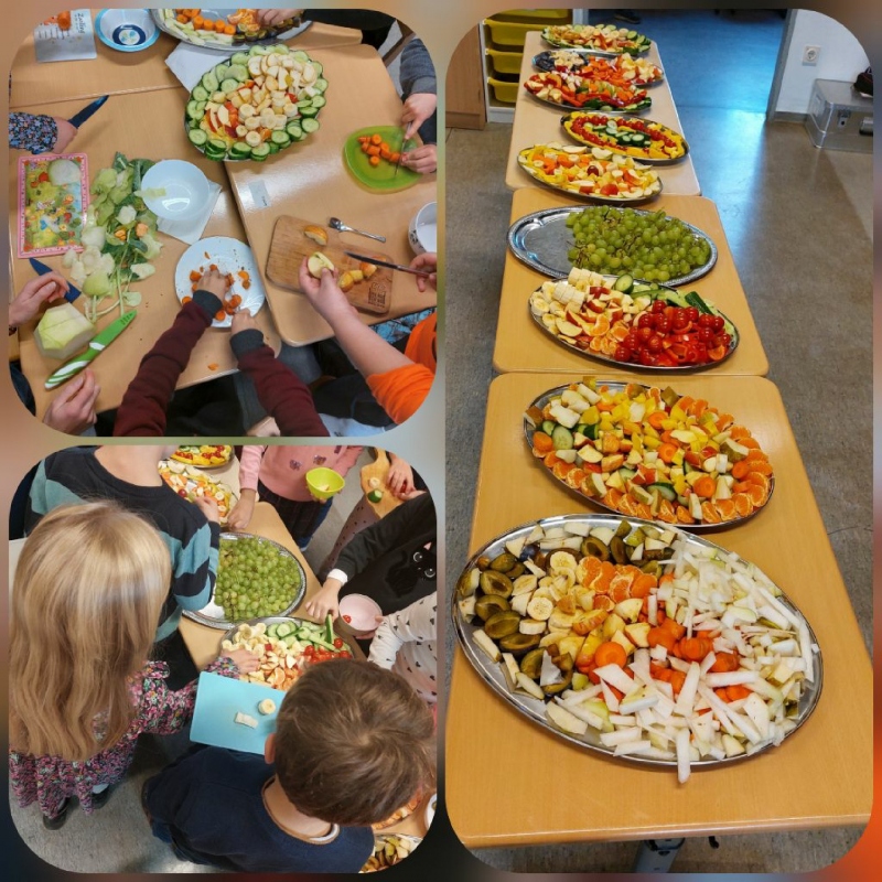 Am Mittwoch 5. Oktober haben auch die Luchse fleißig Obst und Gemüse auf dem Markt eingekauft. Gemeinsam mit den Mäusen, der Deutschsprachlernklasse, wurde am Freitag, den 7.Oktober das Obst und Gemüse gewaschen und geschnitten und anschließend auf Platten gelegt. "Lecker! Lecker!", "Können wir das noch einmal machen?" "Radieschen schmecken gar nicht schlecht" - das waren nur einige Aussagen nach dieser tollen gemeinsamen Aktion.
