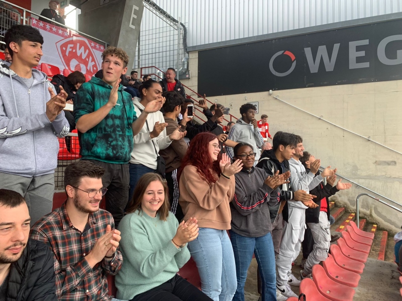 Am Samstag, den 15.10.22, durften alle fußballbegeisterten SchülerInnen der 8./9.-Klassen zum ersten Mal das Kickers-Stadion in Würzburg besuchen. Begleitet wurden sie dabei von den Lehrerinnen Frau Trommler und Frau Fries. Die Tickets bekamen die Jungs und Mädels von den Kickers kostenlos geschenkt - vielen herzlichen Dank dafür! Das kleine Wochenend-Event war ein voller Erfolg, besonders, weil die Würzburger Kickers gegen Greuther Fürth II einen 3:0-Heimsieg einfuhren!